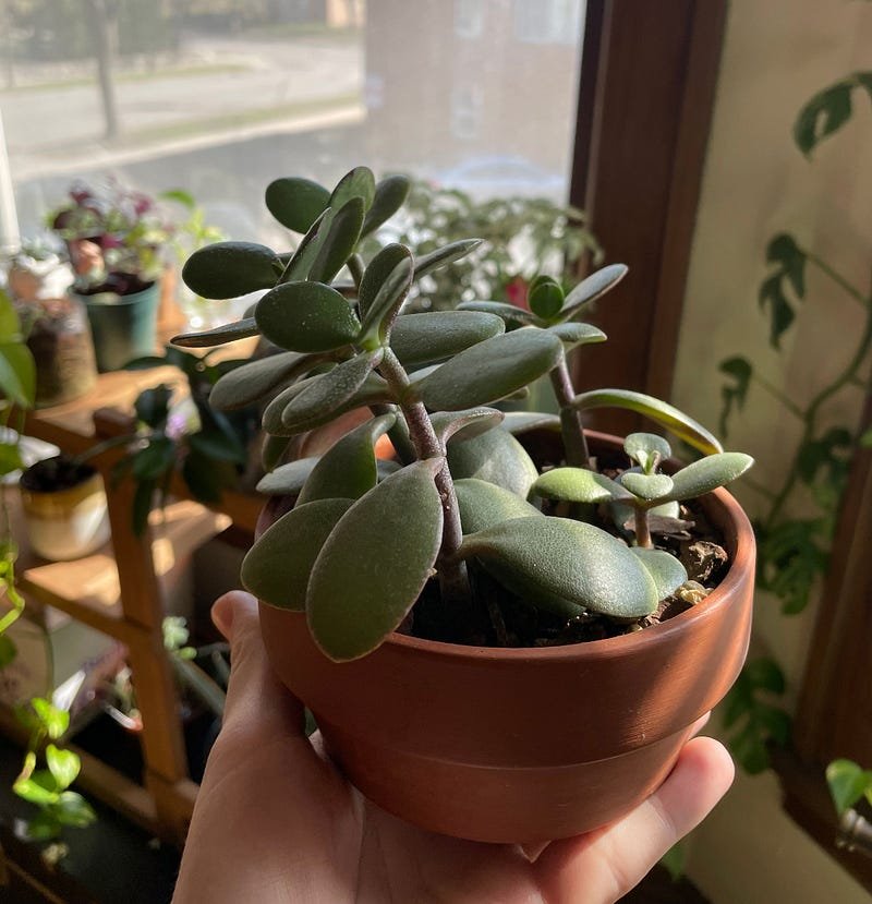 Jade plant: Place in bright indirect/direct light. Water no more than once every two weeks; let the soil completely dry before watering again.